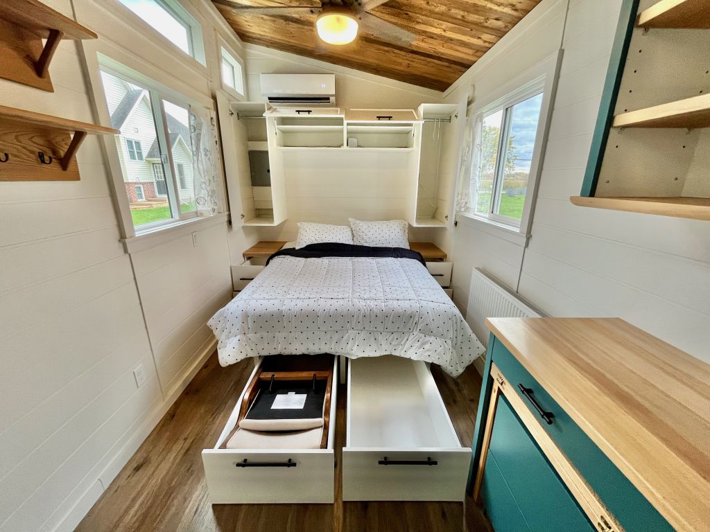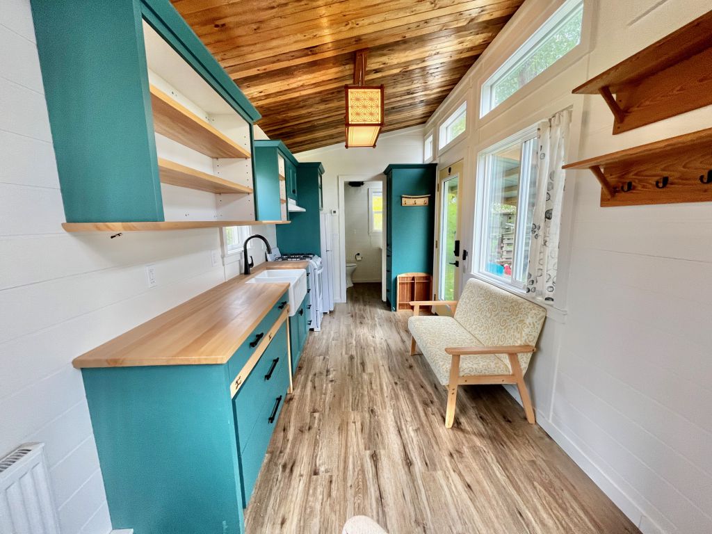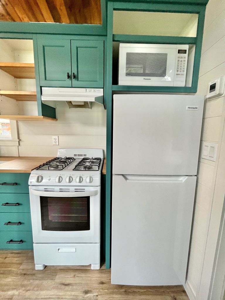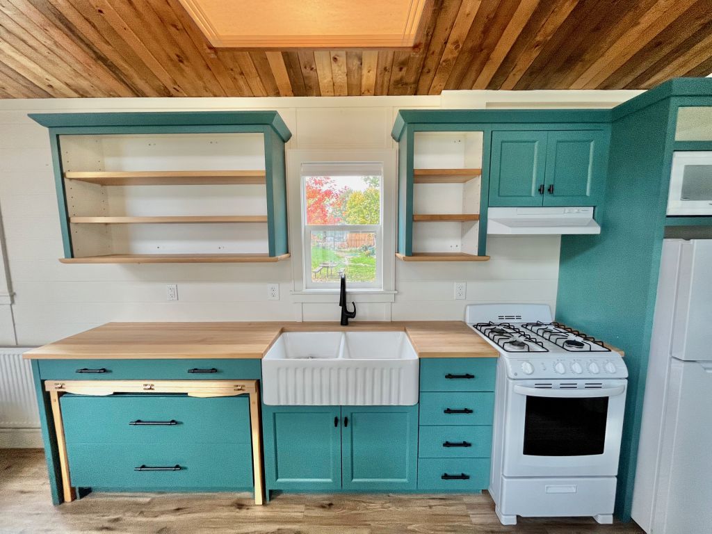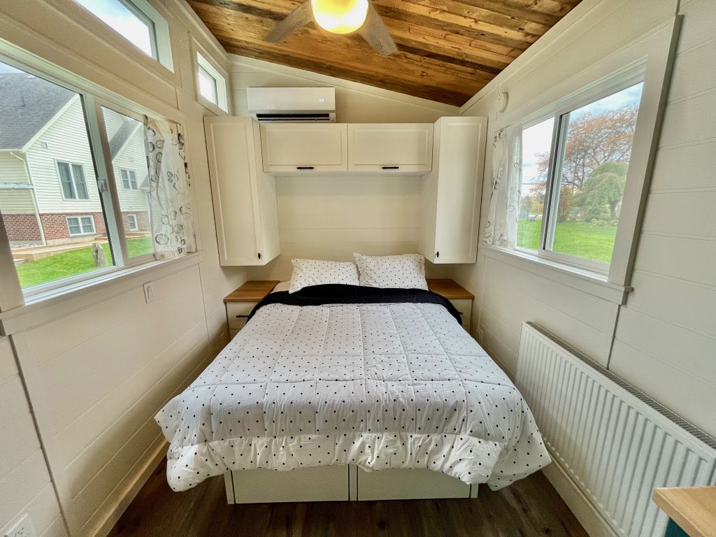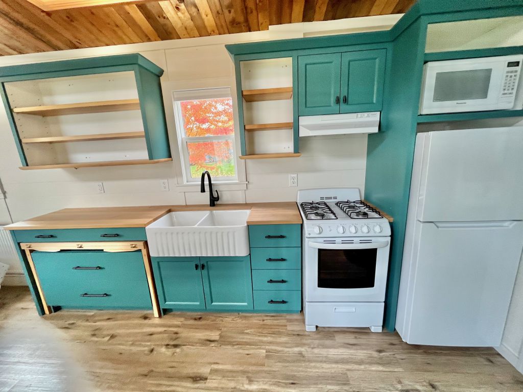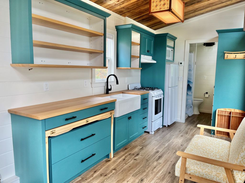 Solid construction with sturdy cabinets, A/C, furnace, composting toilet, and full-size residential fridge and stove.