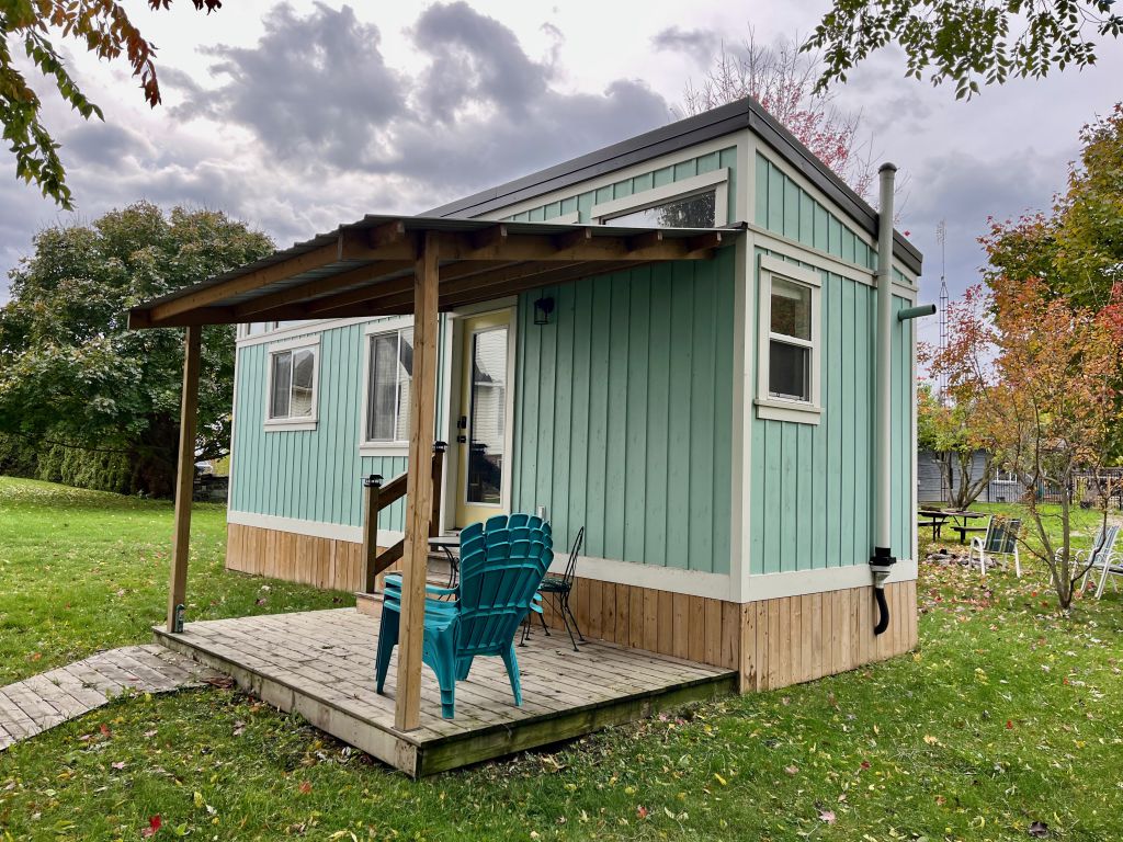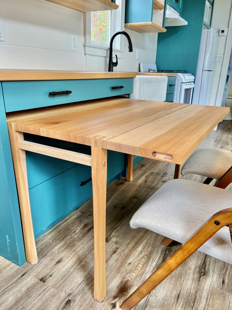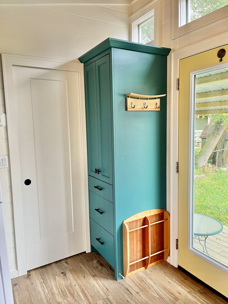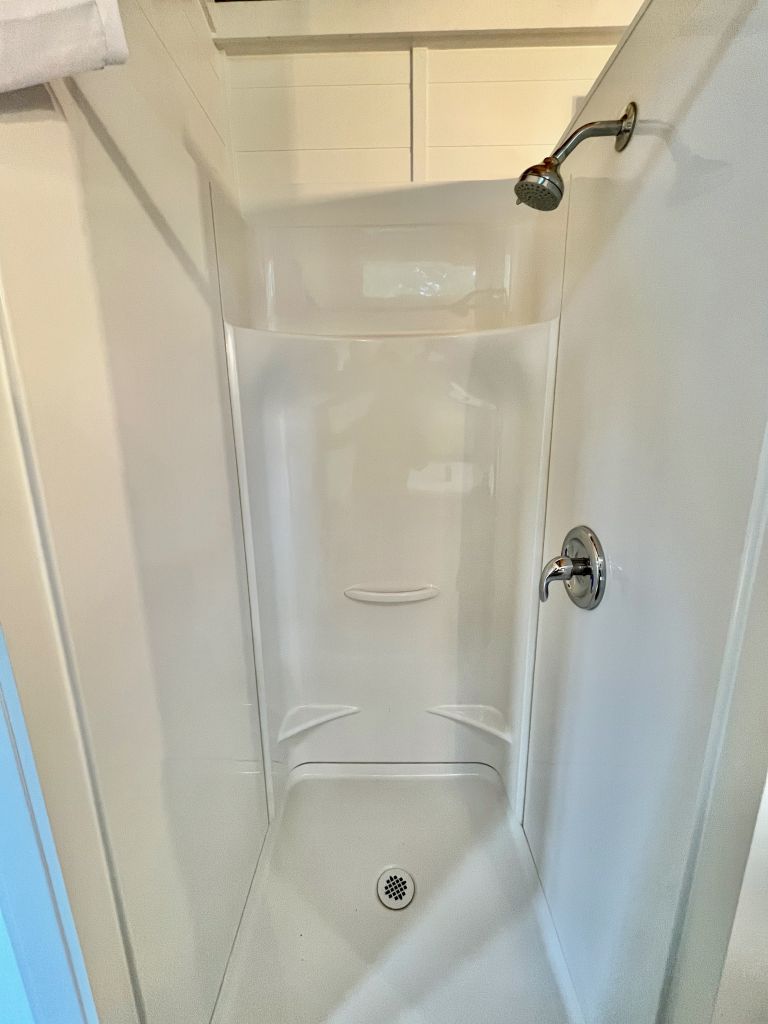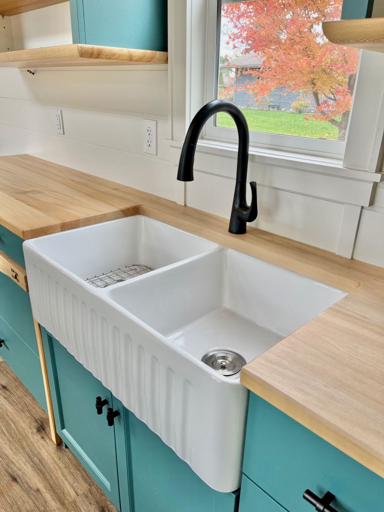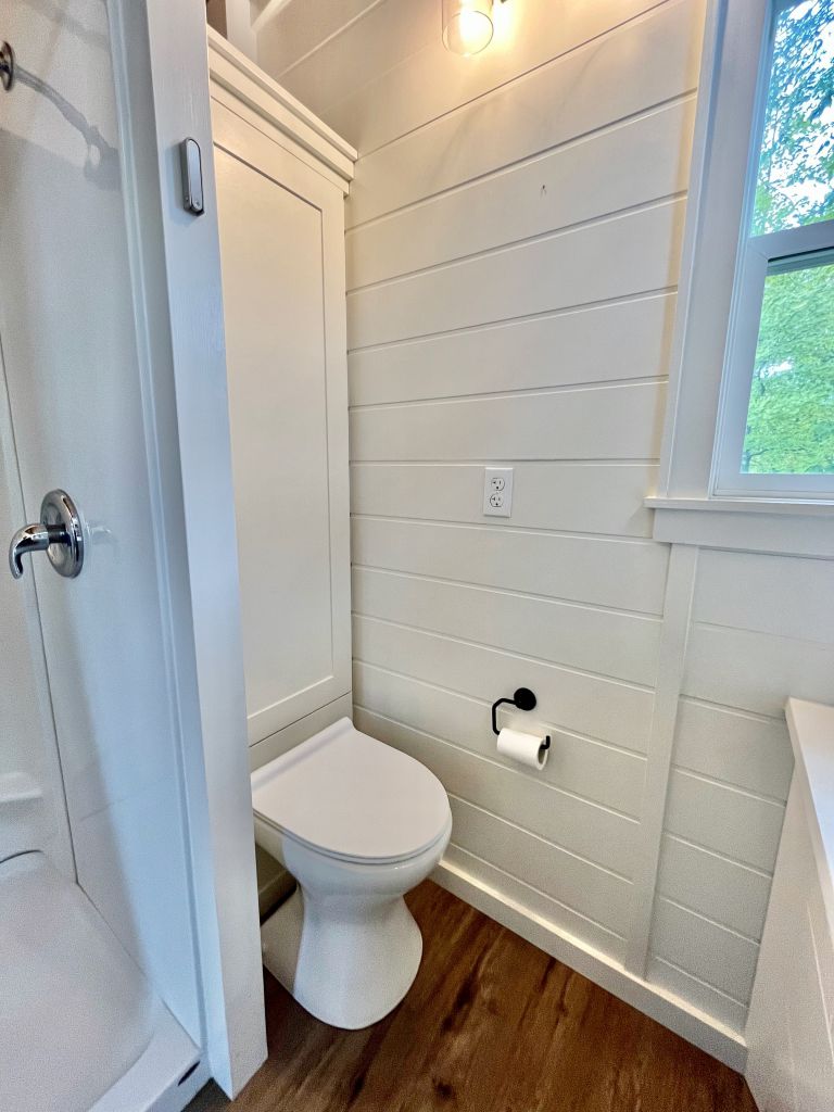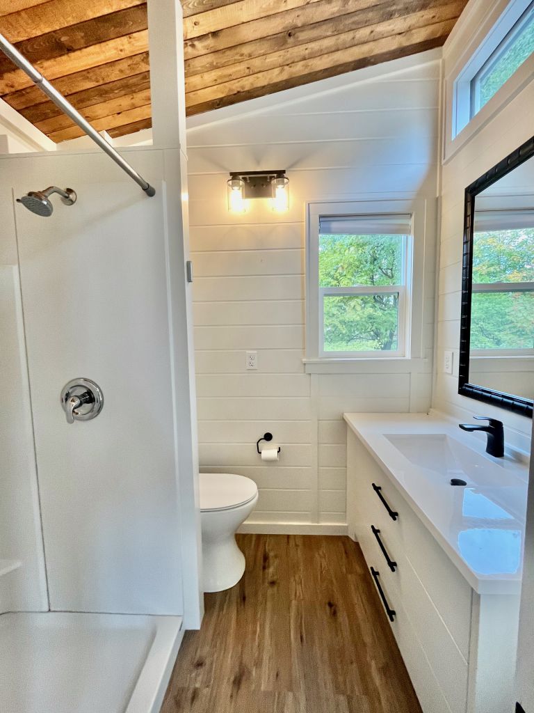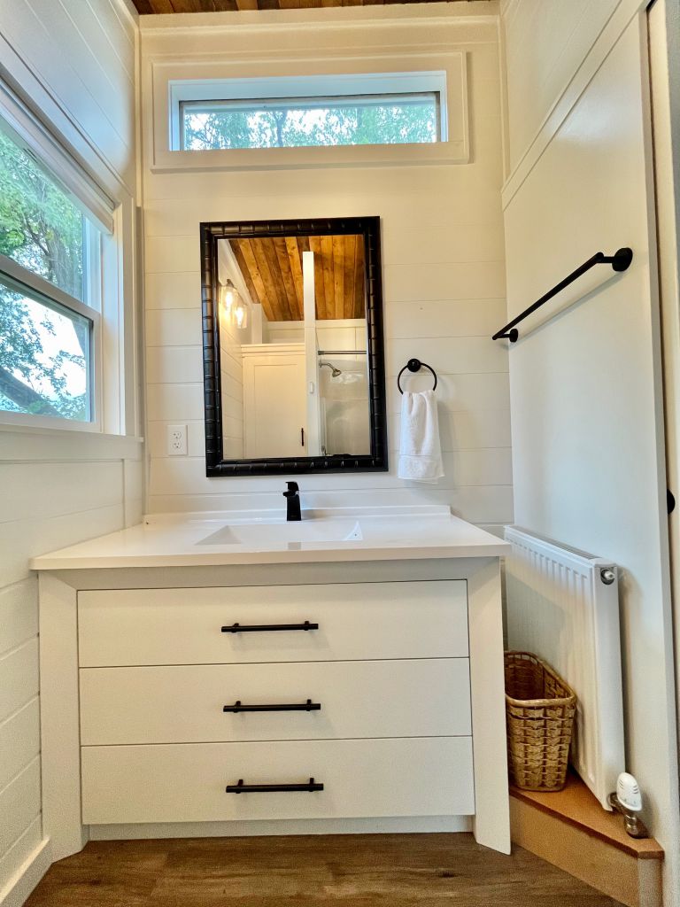 Solid construction with sturdy cabinets, A/C, furnace, composting toilet, and full-size residential fridge and stove.