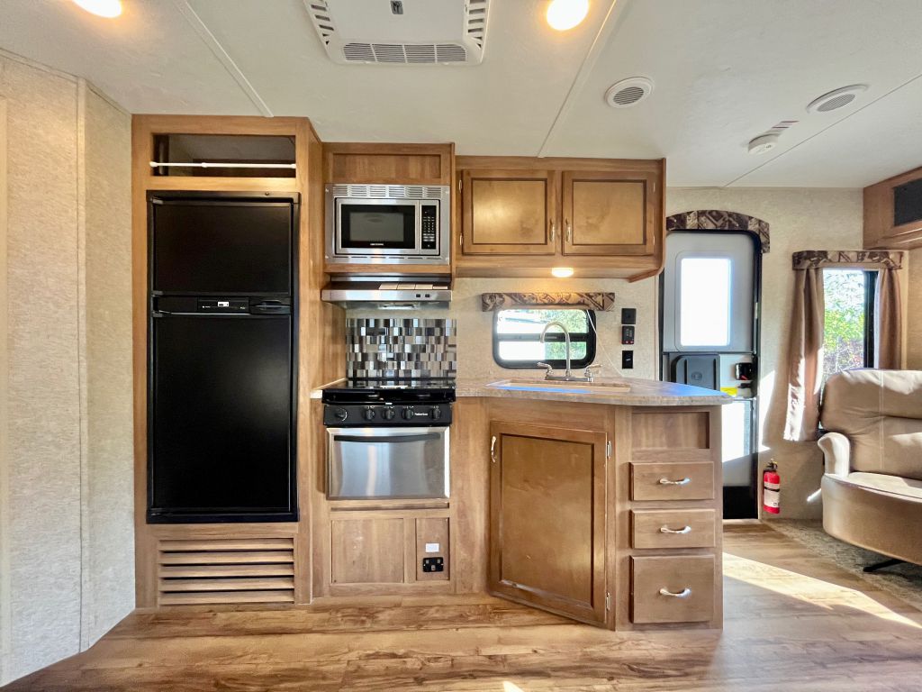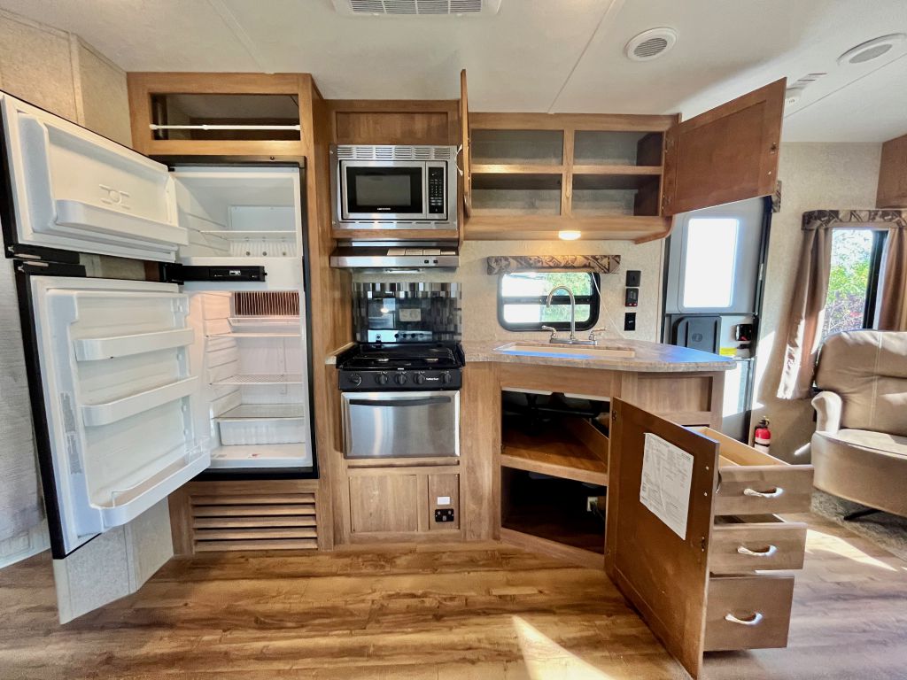 - Kitchen includes fridge/freezer, microwave, and range/oven