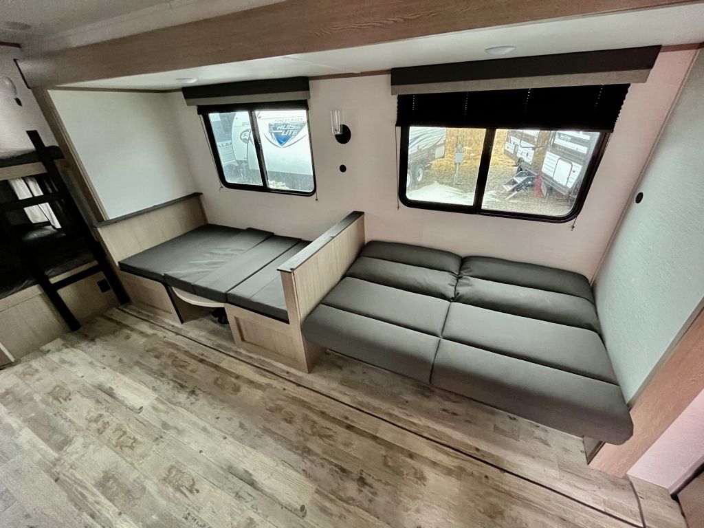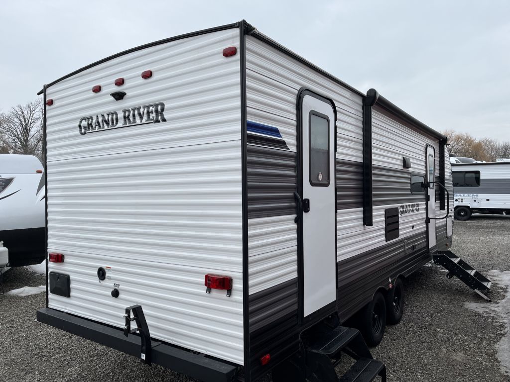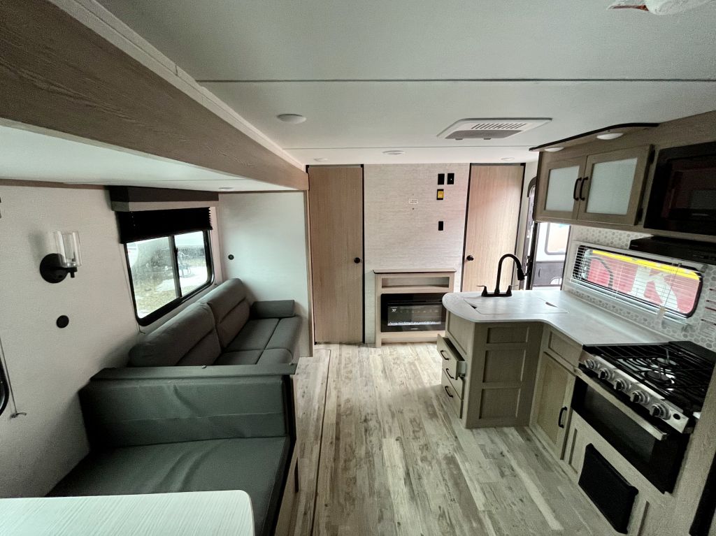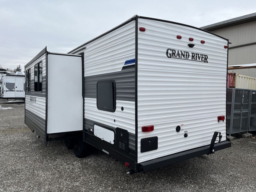 Spacious, family-friendly, and built for effortless weekends — the 2025 Grand River 268BHS offers a full-sized super slide, double-over-double bunks, and a 2-door master bedroom with queen bed in a lightweight, easy-towing package. With a dry weight of 5,177 lbs and an overall length of 29' 6", this trailer is towable by many half-ton trucks yet packs room to comfortably sleep up to 10. Thoughtful features include a 15K BTU A/C, tankless hot water heater, Bluetooth soundbar, and a full 3-burner range with oven, all wrapped in a durable aluminum exterior.