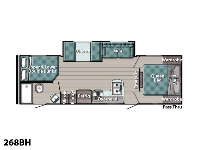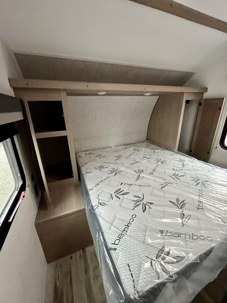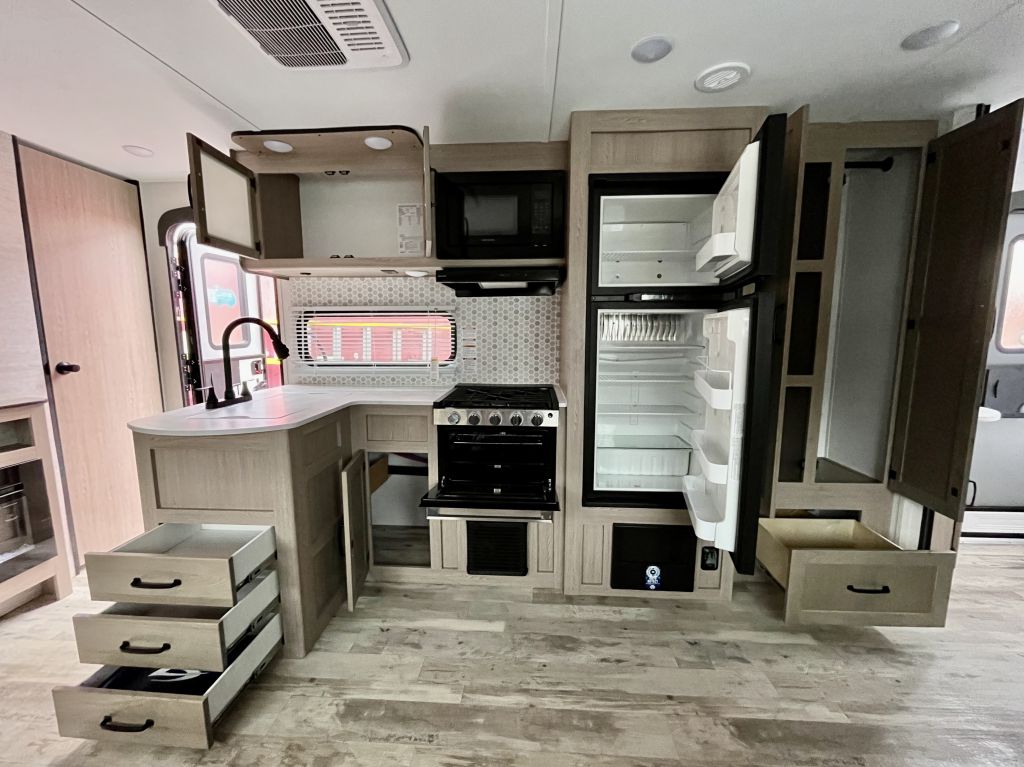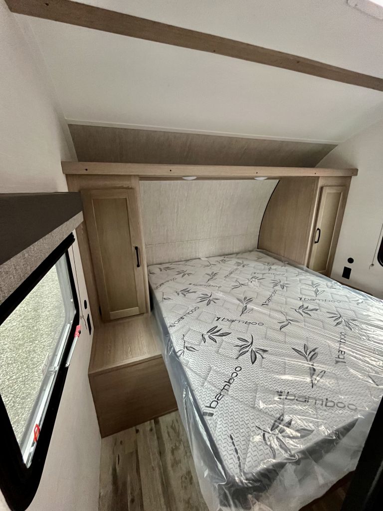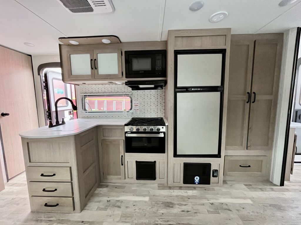 Spacious, family-friendly, and built for effortless weekends — the 2025 Grand River 268BHS offers a full-sized super slide, double-over-double bunks, and a 2-door master bedroom with queen bed in a lightweight, easy-towing package. With a dry weight of 5,177 lbs and an overall length of 29' 6", this trailer is towable by many half-ton trucks yet packs room to comfortably sleep up to 10. Thoughtful features include a 15K BTU A/C, tankless hot water heater, Bluetooth soundbar, and a full 3-burner range with oven, all wrapped in a durable aluminum exterior.