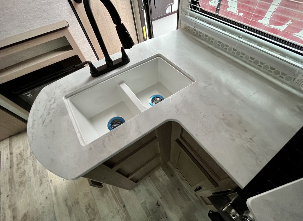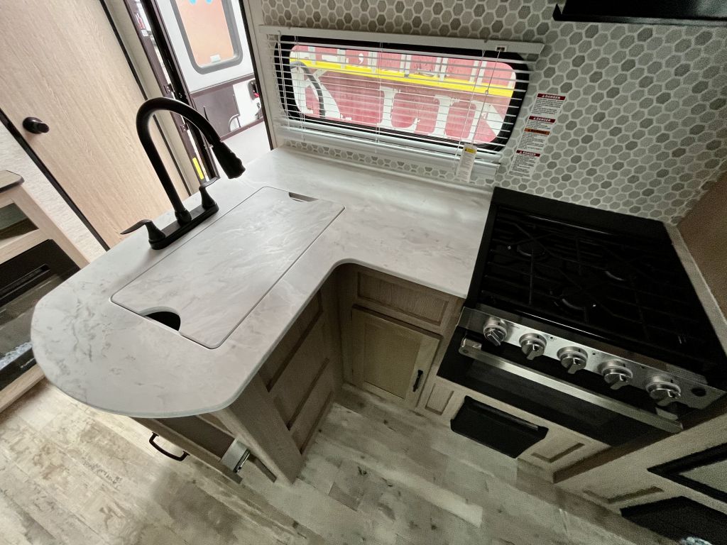 Effortless Meal Prep — A 3-burner range with oven, microwave, and sink cover simplify cooking on the road.